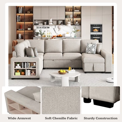 This spacious sofa offers ample seating for family and guests, while its pull-out sofa bed feature provides an instant sleeping solution for overnight visitors. The sofa includes a storage chaise lounge, perfect for stowing away blankets, pillows, or other essentials, keeping your space organized and clutter-free. Two built-in USB ports ensure your devices stay charged and within reach, adding modern convenience to your relaxation time. The set comes with four back pillows, enhancing comfort and providing a cozy spot to unwind. Crafted with high-quality materials, this sectional sofa is both stylish and durable, designed to complement a variety of interior styles. Whether you’re hosting a movie night, lounging with a book, or accommodating guests, this U-shaped sectional sofa is the perfect blend of function and comfort for your home.