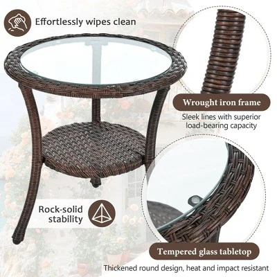 Our outdoor furniture set is a perfect blend of style, functionality, and durability. The harmonious combination of rattan accents and the modern glass table brings together the beauty of nature and contemporary style, significantly enhancing the aesthetic charm of any outdoor space. Functionally, this set is a powerhouse. The high – strength tempered glass tabletop is not only moisture – proof, waterproof, and easy to clean but also highly load – bearing, providing a reliable surface for placing drinks, books, or decorative items. Additionally, the set is designed to be lightweight, with the rattan chairs and round table allowing for easy repositioning. This makes it suitable for various outdoor activities, whether it’s family gatherings, afternoon relaxation, or enjoying a quiet moment in the sun and breeze. When it comes to materials, we spare no expense. The set is crafted with an iron frame and reinforced with anti – rust technology, ensuring it can withstand harsh weather conditions. The premium PE rattan used has a smooth surface, offering flexibility, breathability, and long – lasting comfort, making it ideal for extended outdoor use. In summary, our outdoor furniture set is not only easy to assemble with the provided straightforward instructions and hardware but also offers a perfect balance of practicality and style. It is an excellent choice for those seeking to create a comfortable and aesthetically pleasing outdoor leisure area that can endure the test of time and various weather elements.