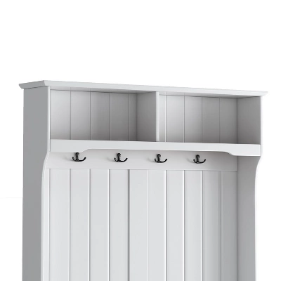 This beautiful hall tree offers a variety of storage solutions in a traditionally designed package. Featuring simple shapes, elegant swivel feet, and beadboard paneling. Two small shelves are perfect for storing purses, books or mail baskets, while four double-sided brass hooks provide ample space for hanging jackets, scarves, hats and handbags. The built-in storage bench includes a roomy cabinet for storing seasonal items like winter hats and gloves.