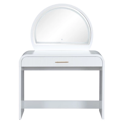 This vanity table combines elegant design with practical functionality, making it a stylish and versatile addition to your room. Featuring beautifully curved edges on the table corners and a wavy texture on the drawers, it enhances the overall aesthetic appeal while ensuring safety by minimizing sharp edges. In terms of functionality, this vanity offers ample storage space with a well-designed drawer, perfect for organizing cosmetics, jewelry, and other beauty essentials, keeping your items neatly in place and easy to access. Additionally, it includes an LED makeup mirror with a touch screen, providing the perfect lighting for flawless makeup application. Besides, the mirror is removable, allowing you to transform it into a simple desk whenever you need additional workspace. Crafted from high-quality materials, this vanity table is not only durable but also comfortable to use, with a smooth surface and sturdy construction for long-lasting performance. In summary, this vanity table is a perfect blend of elegance, functionality, and durability. Ultimately, it serves as an ideal gift for loved ones on special occasions like birthdays, Mother’s Day, or Valentine’s Day, making it a thoughtful and versatile choice.