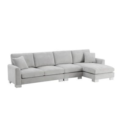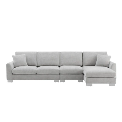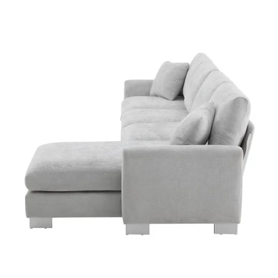 Elevate your living space with our 5-Seat L-Shaped Chenille Oversized Sectional Sofa Set. Crafted for comfort and style, its sumptuous chenille upholstery in white/light gray adds modern sophistication. Accompanied by two free pillows, it offers ample seating for gatherings or relaxation. Supported by a sturdy frame of solid wood, manufactured wood, and iron, with sleek aluminum legs, this sectional ensures durability. Sink into luxurious comfort with foam-filled cushions, while its modular design allows for versatile arrangement. Easy-to-clean upholstery ensures hassle-free maintenance, making it perfect for everyday use. Experience the perfect blend of elegance and relaxation with our 5-Seat L-Shaped Chenille Oversized Sectional Sofa Set.