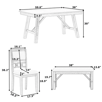 - 【Dining Table Set of 6】The dining table includes a table, four chairs and a bench, perfect for a family of six or a small gathering. The spacious 59.6-inch tabletop provides plenty of room for comfortable dining. This set is perfect for creating an intimate and comfortable dining or gathering setting.