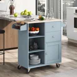 Rubberwood Countertop Kitchen Island, 4 Wheel Kitchen Trolley With Spice Rack, Towel Rack, 3 Open Shelves And 2 Drawers – ModernLuxe