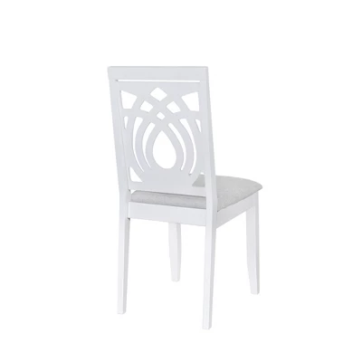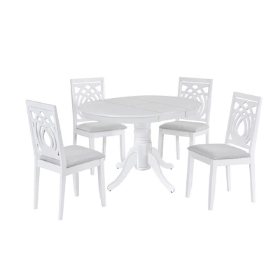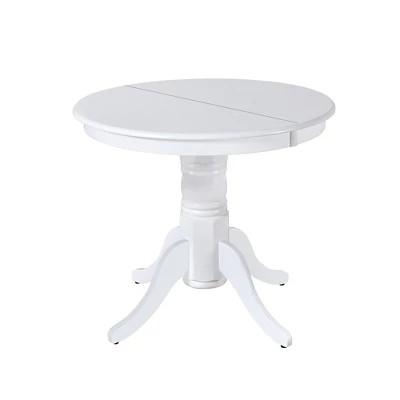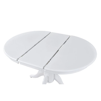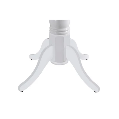 - Featured classic white finish, this dining table is anchored by a heavy pedestal with splayed feet which is designed to work in any decor.