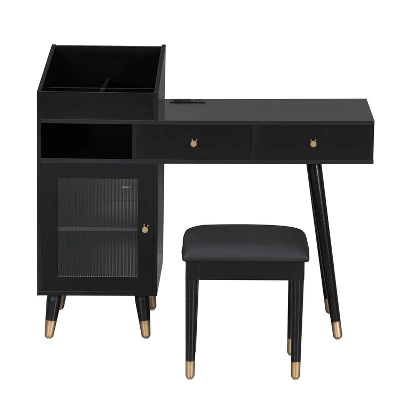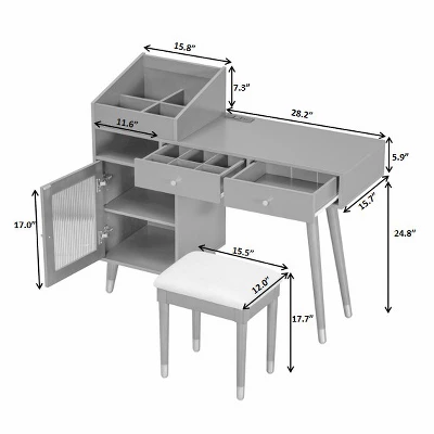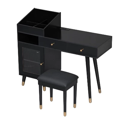 This modern makeup vanity desk, with its minimalist design, glossy finish, sturdy wooden legs, and tempered glass – door storage cabinet, exudes elegance while seamlessly fitting into dressing rooms, bedrooms, home offices, or small spaces. Boasting a versatile and space – saving build, it can effortlessly transform into a makeup station, writing desk, or laptop workspace. Functionally, it excels with two large drawers, a top open shelf, and a roomy cabinet that keep skincare, makeup, and stationery organized, and the spacious desktop aids in maintaining a clutter – free area. Adding to its convenience is a built – in charging station with two outlets and two USB ports for easy device powering. Crafted from high – quality MDF board and paired with a soft PU padded stool for comfort, its sturdy construction ensures longevity. With detailed installation instructions, numbered parts, and spare components provided, assembly is straightforward. In sum, this vanity desk perfectly marries style, functionality, and durability, making it an excellent choice for daily use.
