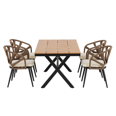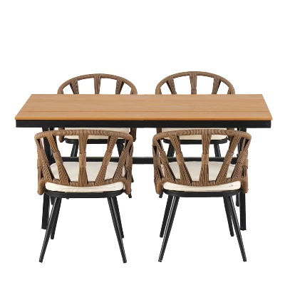 Transform your backyard into a luxury retreat with the ModernLuxe 5-Piece Outdoor Dining Set. This meticulously crafted ensemble combines contemporary design with industrial-grade durability, featuring a spacious rectangular table and four sophisticated handwoven armchairs. Perfect for poolside brunches or evening dinner parties, this set brings high-end comfort to any outdoor living space.