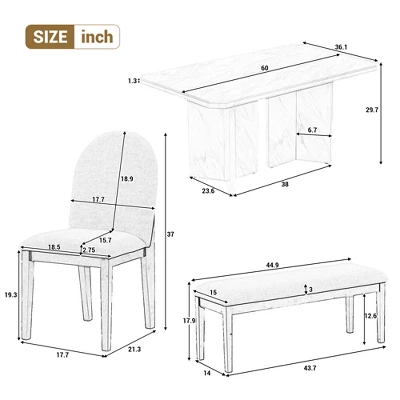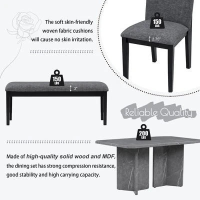 - Set Includes: 1 Table, 4 Upholstered Chairs, 1 Bench