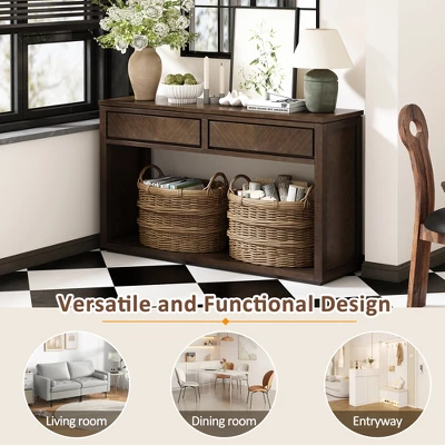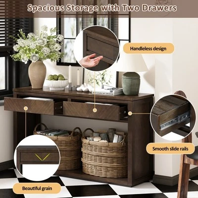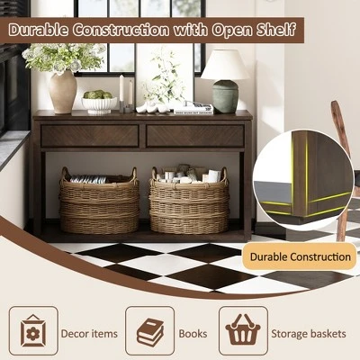 Add a touch of rustic charm to your home with this Rustic Wooden Console Table. Perfectly designed for entryways, hallways, or living rooms, this versatile accent table combines elegance and practicality. Its sturdy wooden construction ensures durability, while the warm, natural finish complements various decor styles, from farmhouse to contemporary. Equipped with spacious storage drawers, this console table helps you keep your essentials organized and within reach. The open lower shelf provides additional storage or display space for books, decor items, or baskets. Its sleek design and clean lines make it a standout piece that enhances the ambiance of any space. Whether you use it as an entryway table to welcome guests or as a living room centerpiece, this rustic wooden console table offers a perfect balance of style and functionality for your home.