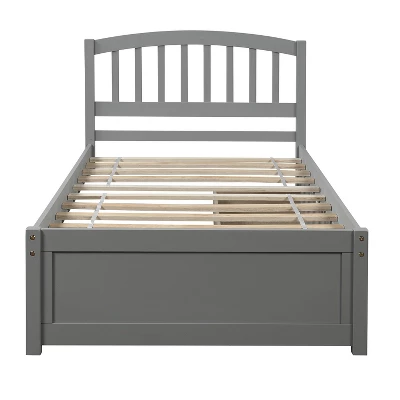 Spend your nights comfortably and in style with this stylish and functional twin-sized wooden bed frame. Including aesthetically pleasing head and footboards and boasting clean, curvaceous lines, this frame is as beautiful as it is useful. Including two extra-large storage drawers on sleek casters, and boasting extra storage space and an all-wood design, this bed frame is built to last. Extra storage space is included opposite the drawer which is also great for placing your shoes or even traveling suitcases. Three baffles under the bed can prevent the drawers from running around.